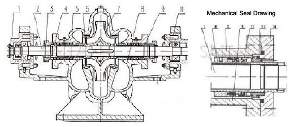 S、SH型泵为单级、双吸、泵壳轴向中开的蜗壳式离心泵。泵吸入口与吐出口均在泵轴心线下方,呈水平方向。 泵主要零件有泵体、泵盖、叶轮、轴、双吸密封环等。 泵进出水法兰上,设有安装真空表和压力表的管螺孔,进出水法兰底部设有放水管螺孔。法兰按GB标准制作,也可采用ISO、DIN、BS或ANSI标准制作. 叶轮经平衡校验合格后,用轴套及轴套螺母固定在轴上,其轴向位置可通过轴套螺母进行调整。叶轮轴向力利用其叶片对称布置达到平衡。泵轴由两套滚动轴承支撑,安装在泵体两端。轴承采用油脂润滑。 泵体上设有双吸密封环,拆卸更换方便。 泵通过弹性柱销联轴器或金属迭片式联轴器由电动机直接传动。驱动机也可采用内燃机、气轮机。 轴封可采用填料密封,也可采用机械密封。轴封冷却冲洗水可通过泵盖中开面上的凹槽进入轴封腔,也可通过外接冷却水管进入轴封腔。检修时勿需拆卸进出水管及电动机,维修方便。 根据用户需要,可改变泵结构尺寸。